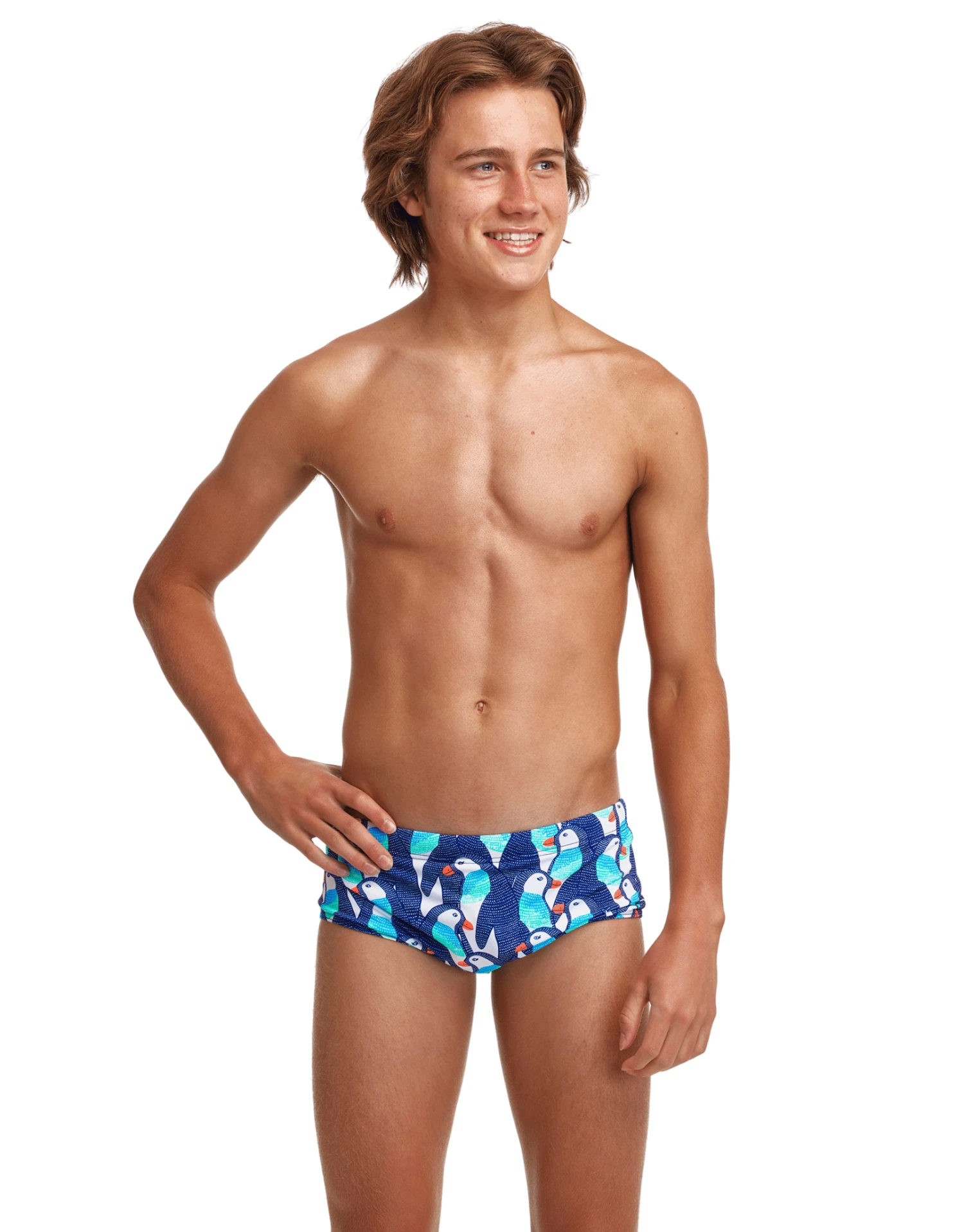 The Boys Pengoo Parade Swim Trunks from Funky Trunks offers a drawcord to keep them locked in position and a wide elastic leg opening and waistband for added comfort around your hips and legs. Well made for durability and comfort, these trunks are made from 100% Italian polyester in Funky Trunks C-Infinity fabric, a 100% Italian polyester that is a colourful breakthrough in chlorine-resistant fabric technology. This design is inspired by penguins in the Antarctic.