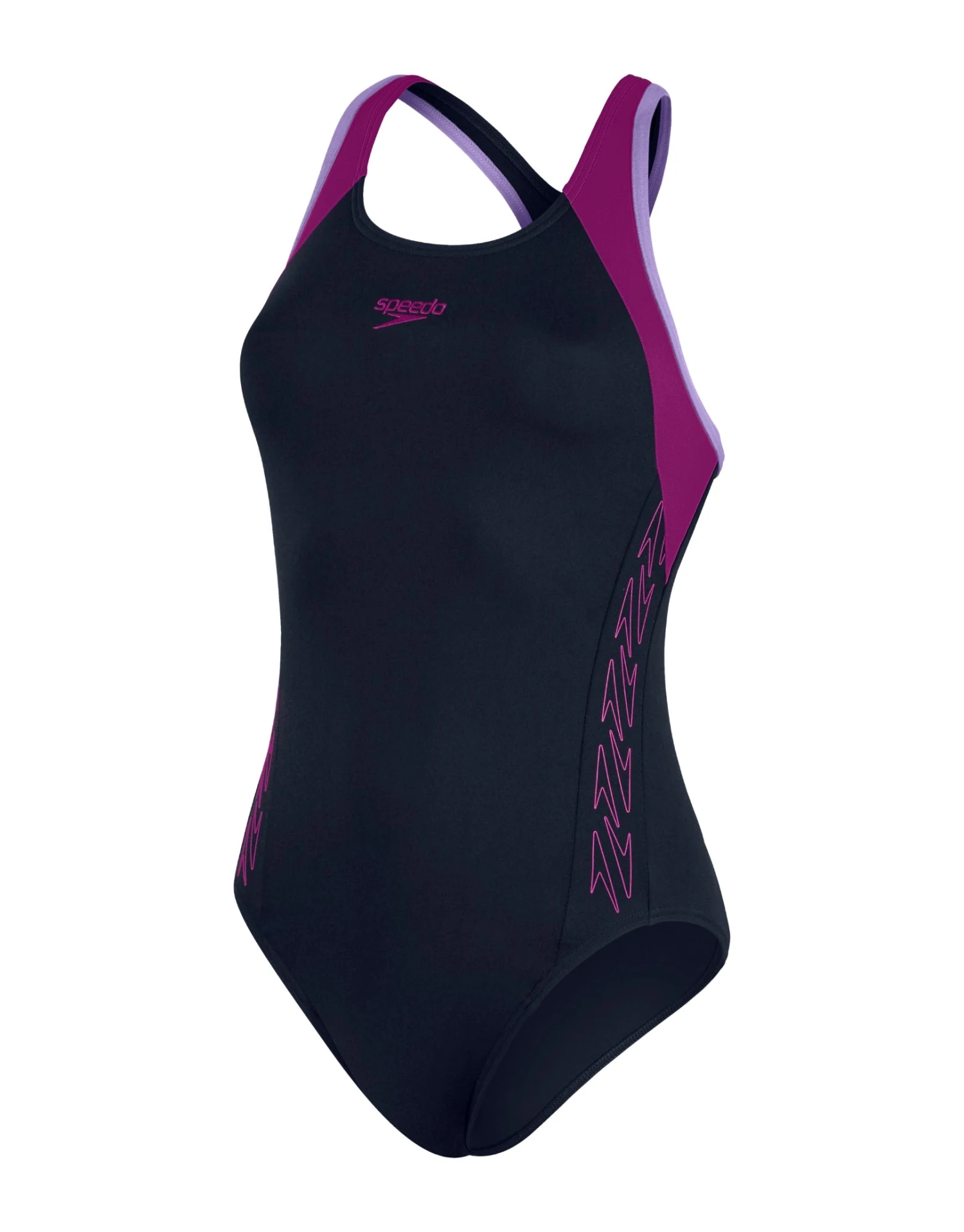 The Hyperboom Splice Flyback from Speedo offers classic sports styling which features a revival of the iconic go-faster boom logo stripe in contrasting purple. The pops of colour continue through the suit’s contrasting straps and panel detail for a stylish and sporty look. Ideal for fitness training, the flyback design offers greater freedom of movement, so you can swim in comfort. It also includes a comfortable bust underband for light support during your workout.Â
