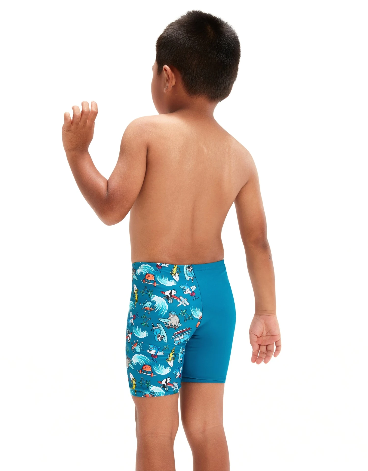 The Speedo Boys Digital Allover Jammer in Pluto Blue boast a lively design with surf-loving characters as they head to Bondi Beach. Ideal for the pool and the beach, this jammer style offers more coverage than shorts and fits just above the knee. The soft and stretchy Endurance10 fabric paired with Creora HighClo keeps these jammers fitting like new for longer.Â